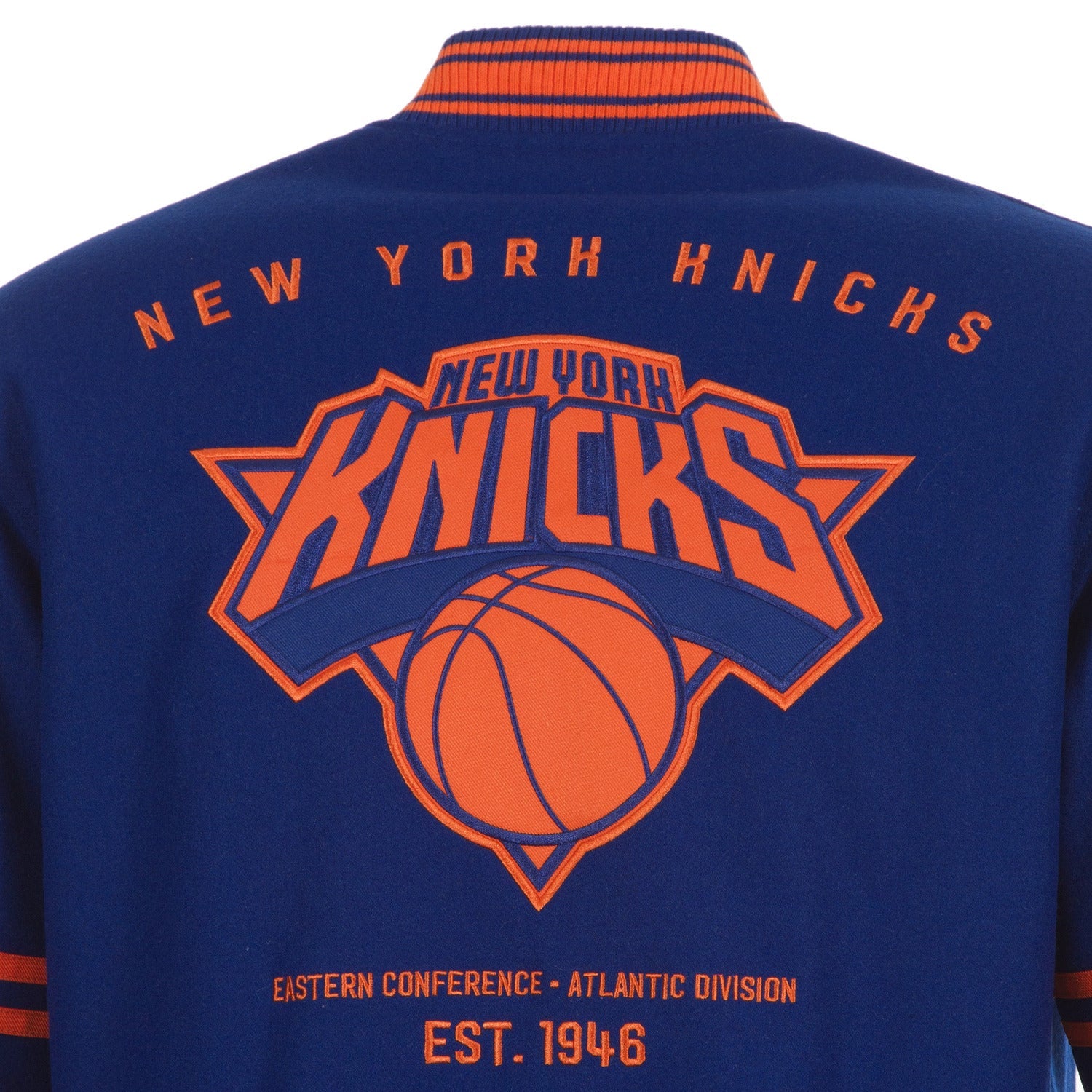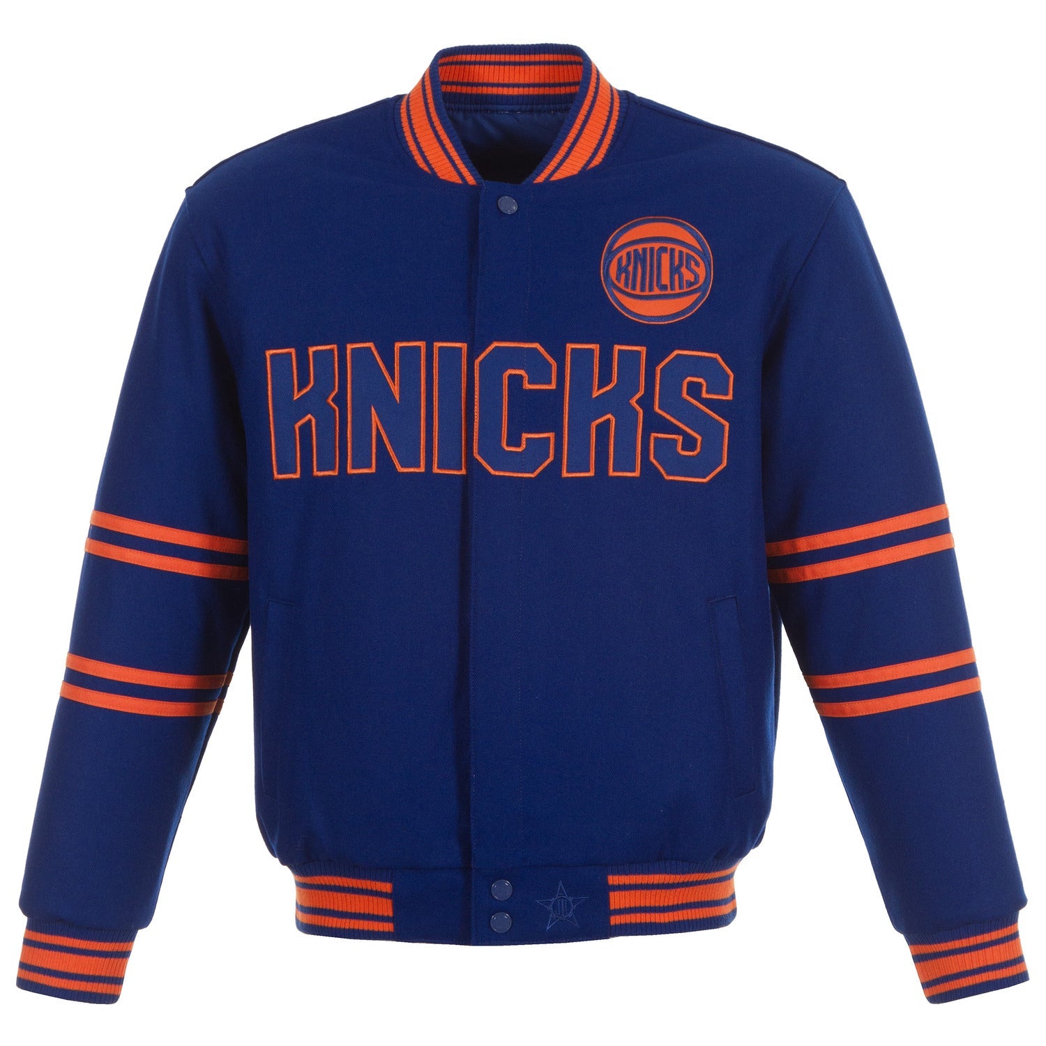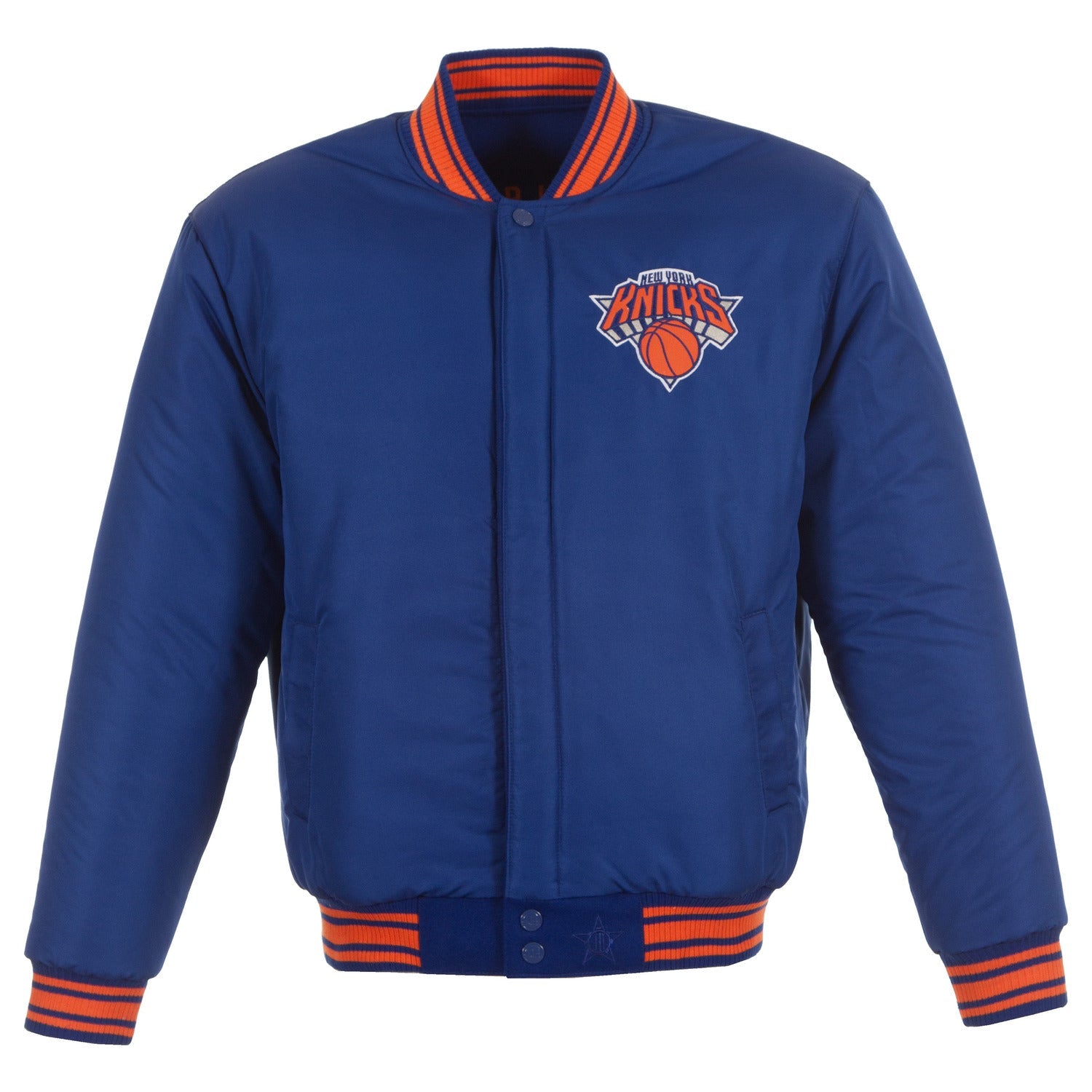 Show your New York Knicks pride in style with the JH Design Knicks Reversible Wool Jacket. This jacket features a classic wool body with team logos on the front and back, perfect for showcasing your team spirit. With its reversible design, you can switch up your look to suit your mood, making it a versatile addition to any fan's wardrobe.