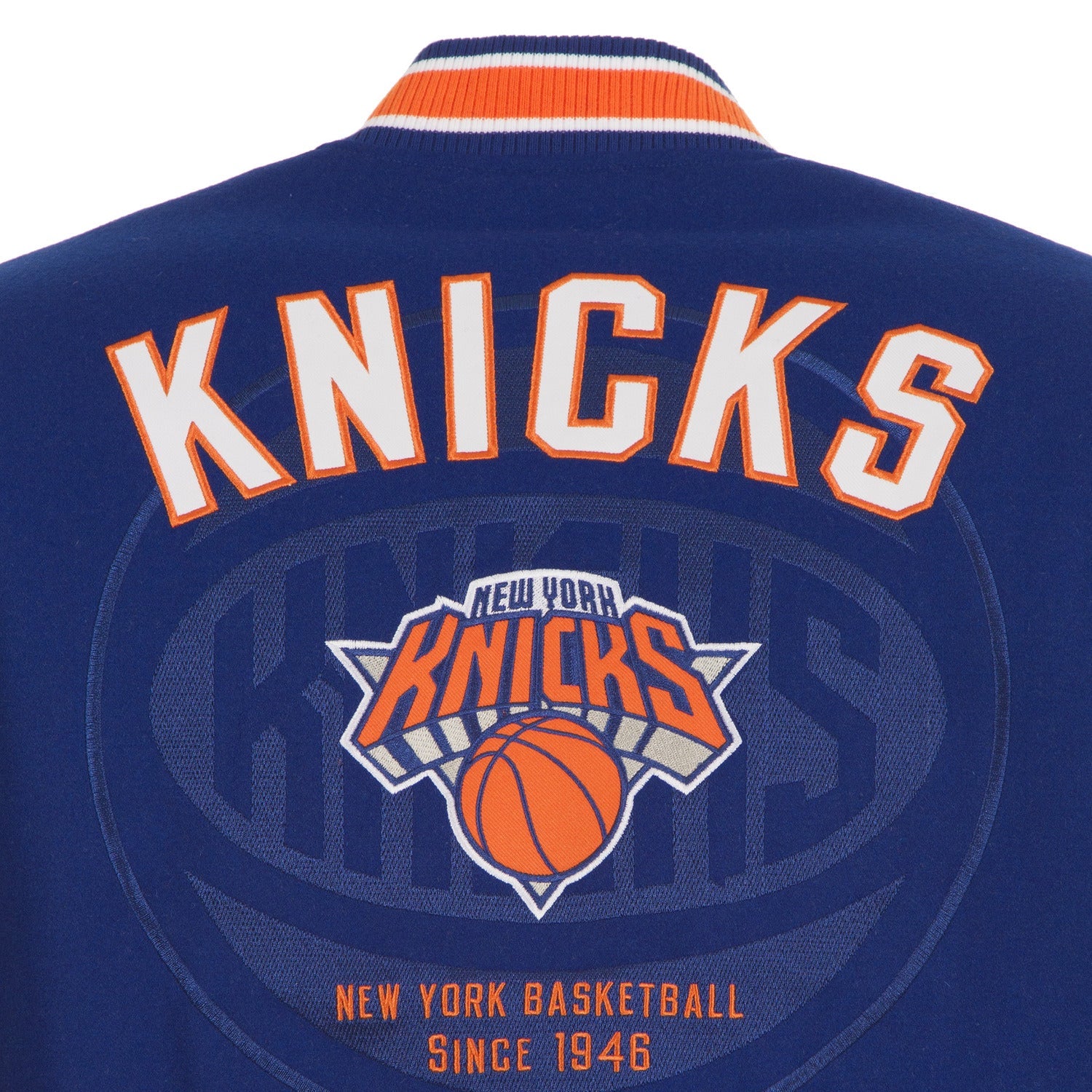 Elevate your game day style with the JH Design Knicks Two-Tone Reversible Wool Jacket. This jacket features a classic wool body with contrasting team colors on each side, giving you two stylish looks in one. With its reversible design and high-quality construction, it's the perfect choice for any die-hard Knicks fan looking to stay warm and show off their team pride.