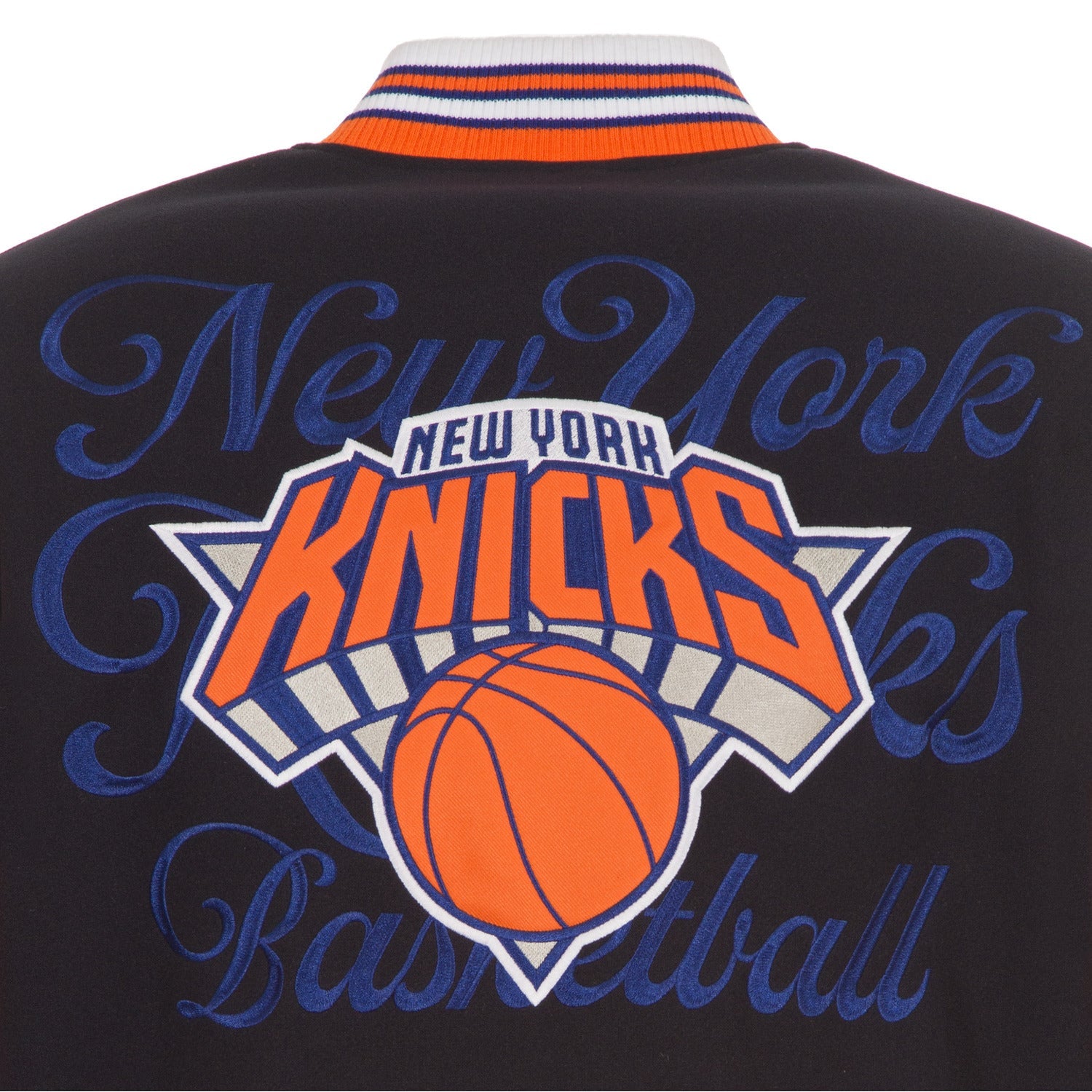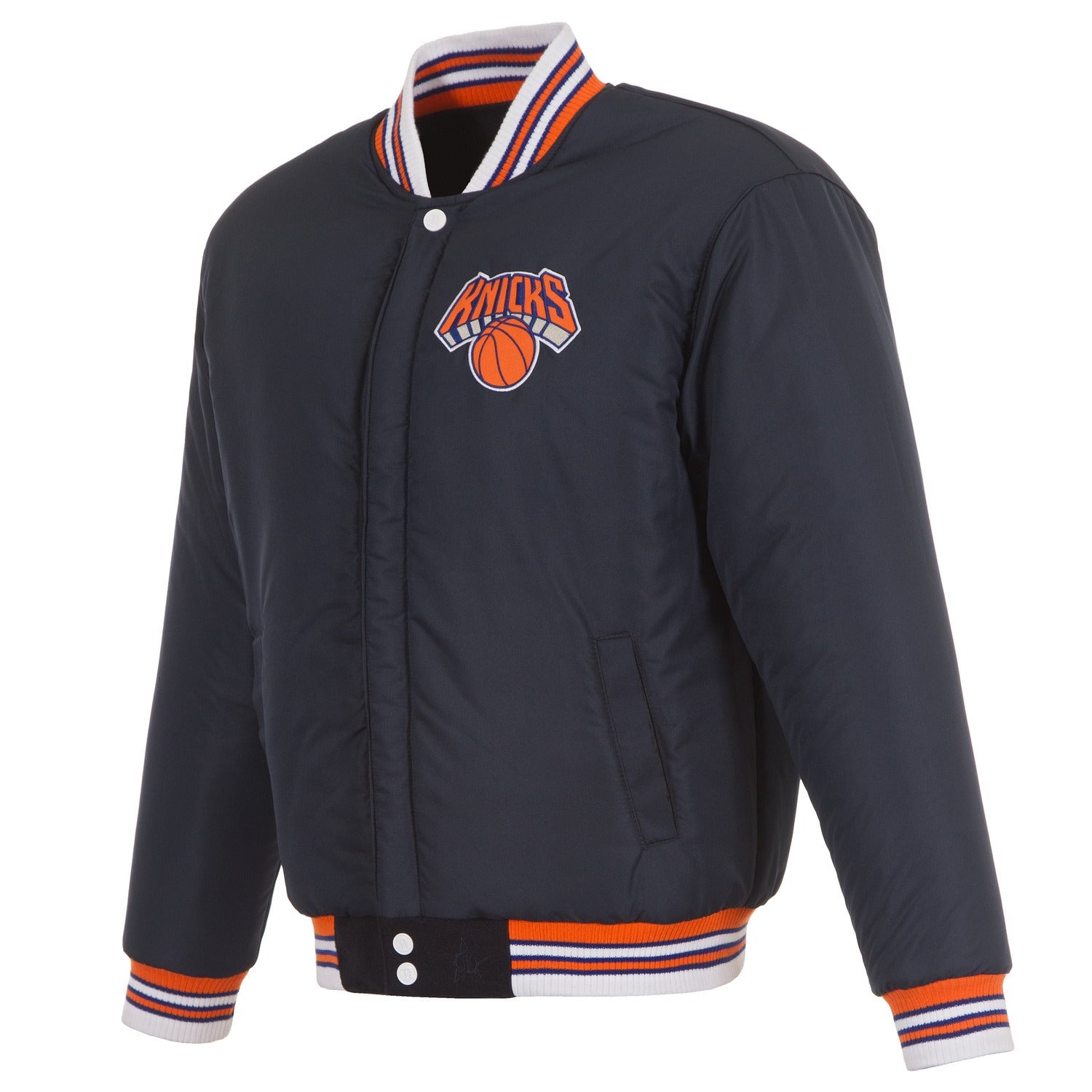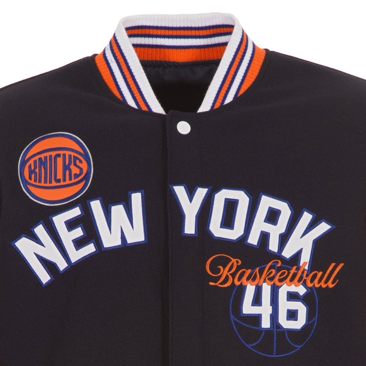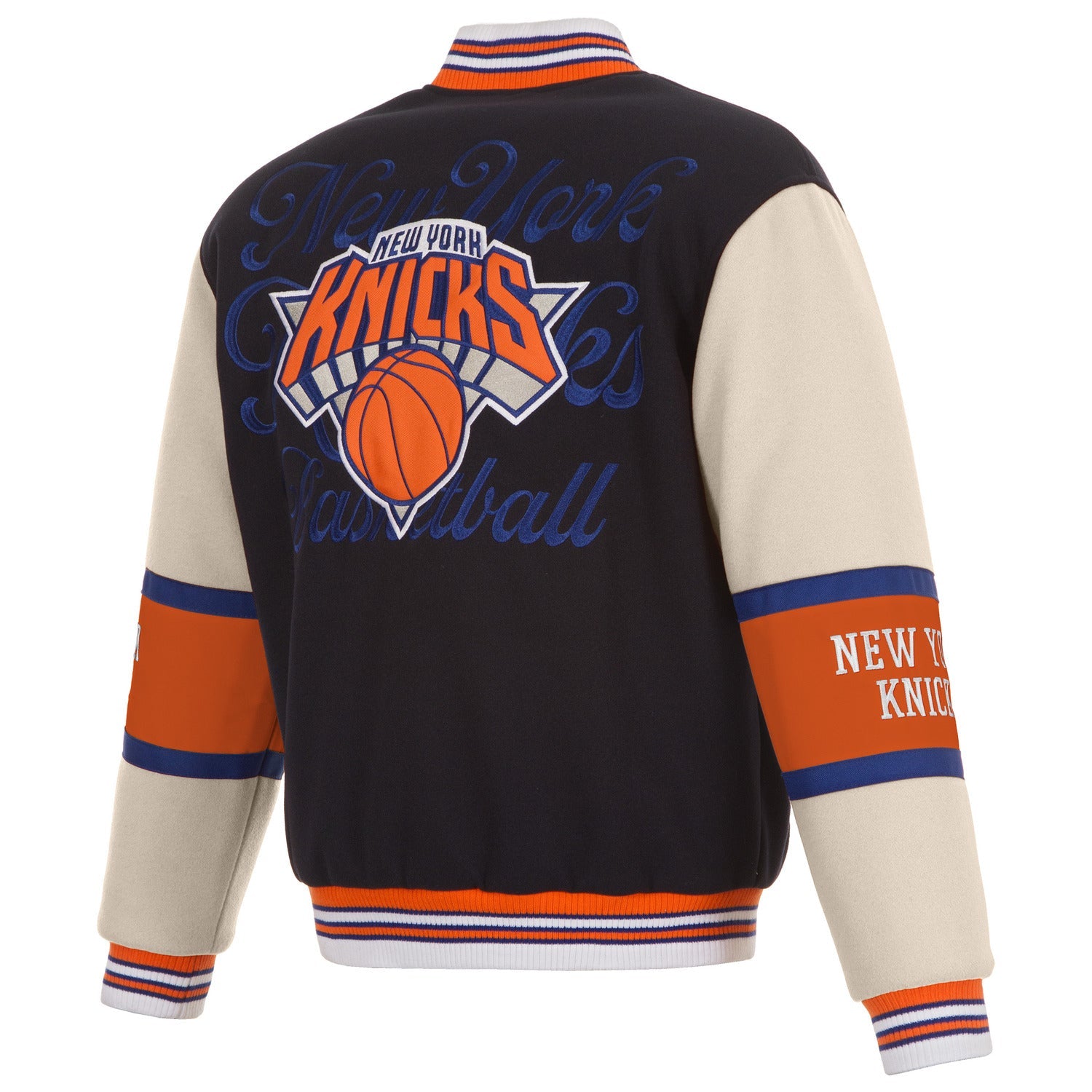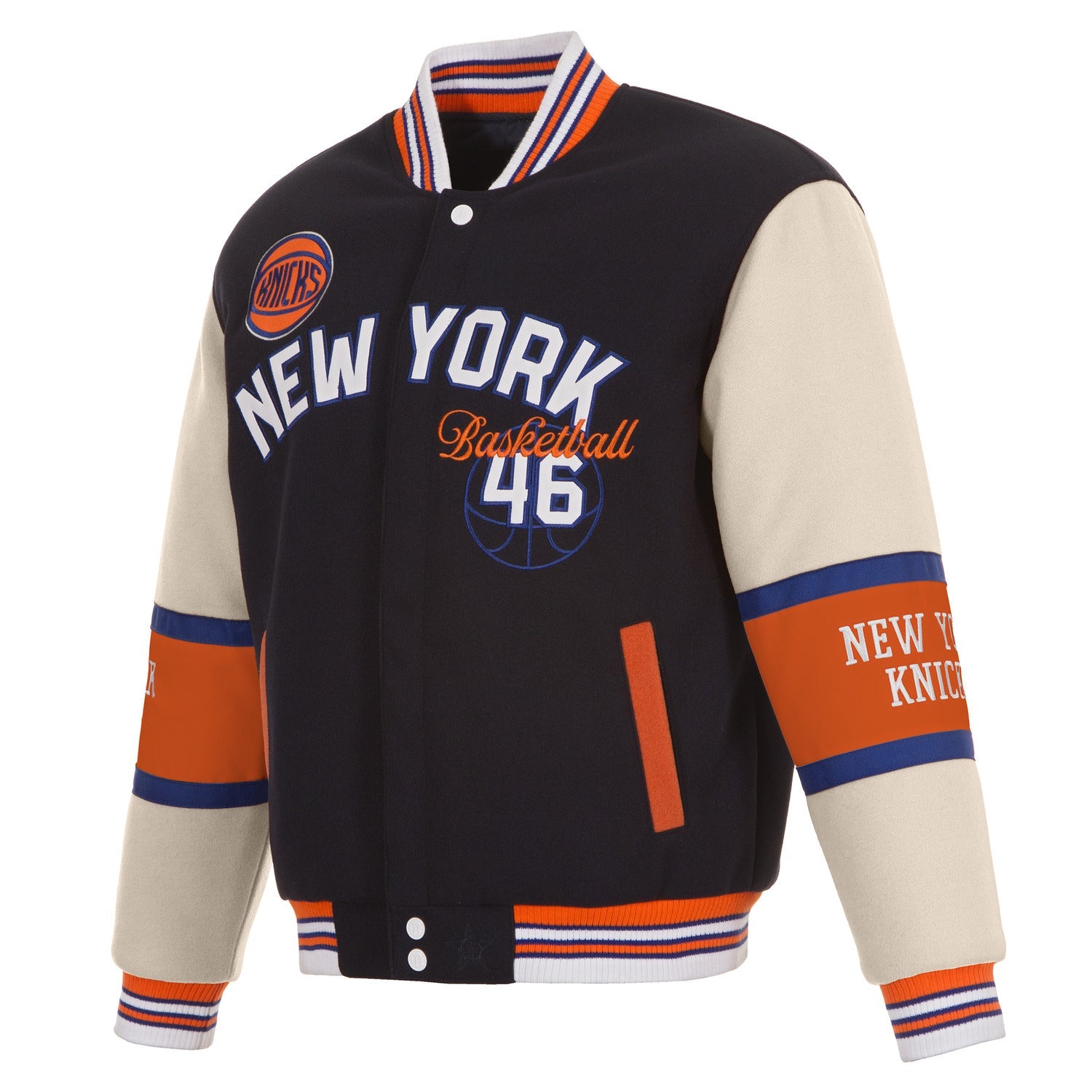 The "JH Design Knicks Two Tone Wool Reversible Navy/Cream Varsity Jacket" embodies the spirit of New York basketball with its bold and classic design. This reversible jacket features a navy blue body with cream sleeves on one side and a solid cream design on the other, both adorned with vibrant Knicks logos and the year 1946, marking the team's establishment. Made from high-quality wool, this varsity jacket ensures warmth and comfort, making it an excellent choice for Knicks fans to showcase their support in style during the colder seasons.