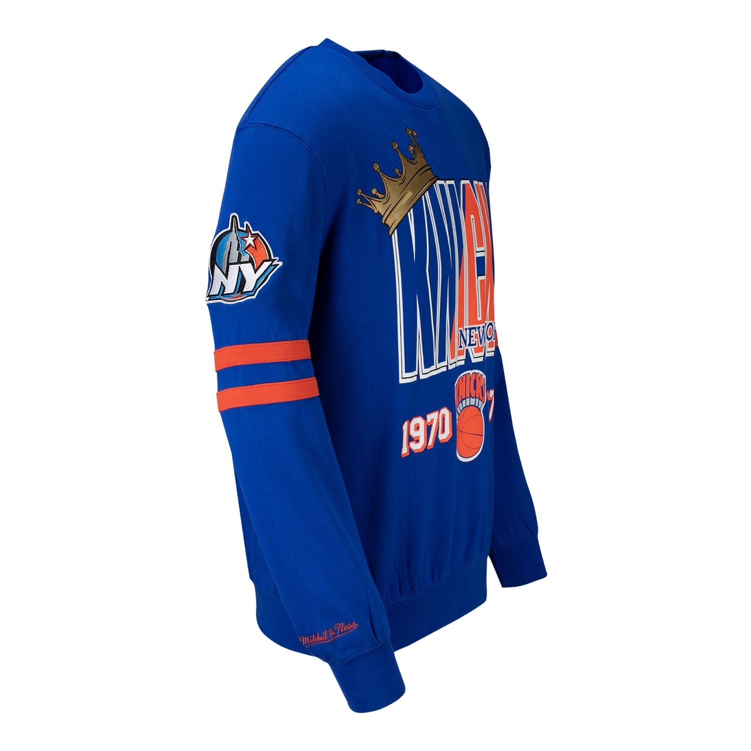 Go big in showing off your New York Knicks devotion with this Mitchell & Ness Knicks All Over Crew Sweater. It features attention-grabbing New York Knicks graphics on the front and shoulders. Plus, coordinating sleeve stripes draw even more attention to your passionate fandom.